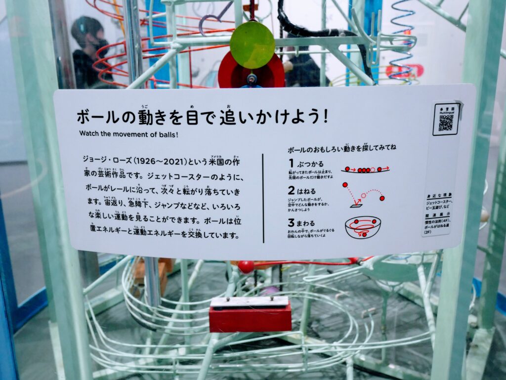「ぶつかる・はねる・まわる」と注目してほしい点を絞ることで、なんとなくボールの動きを見るのではなく、「見る」から「探す」へと展示の楽しみ方を変化させるヒントが書かれています。
